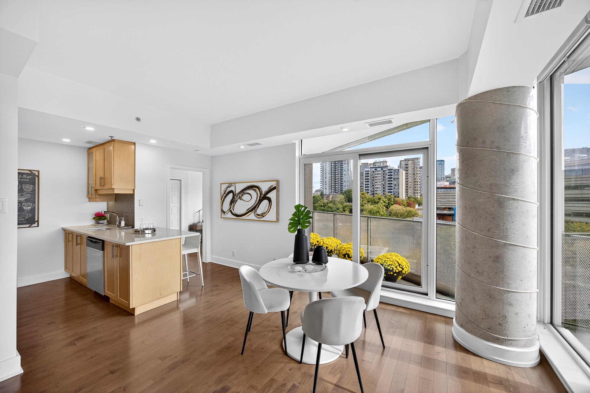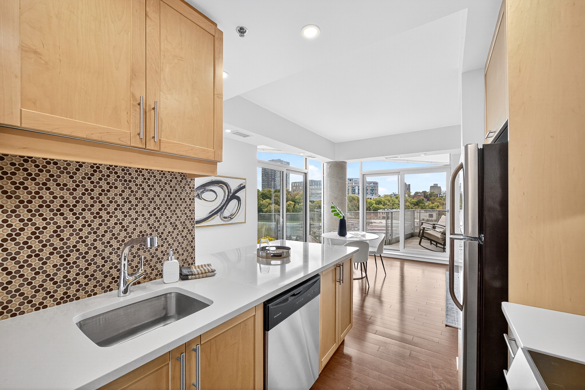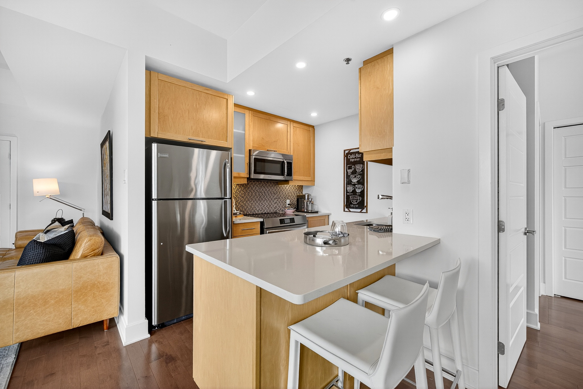 The open-concept layout has hardwood floors and high-quality finishes. The kitchen is both functional and attractive, with quartz countertops, stainless steel appliances and LED pot lights. Two private balconies provide outdoor space for relaxing or entertaining. Upgrades like California Closets, an upgraded washer and dryer, and enhanced lighting make daily living easy and practical.
